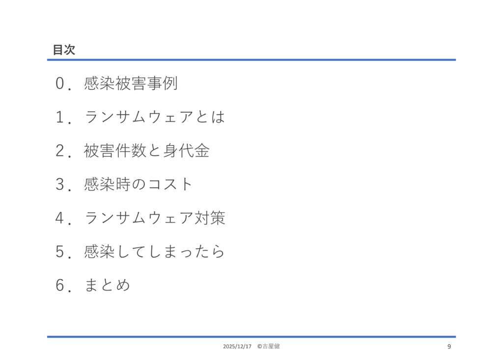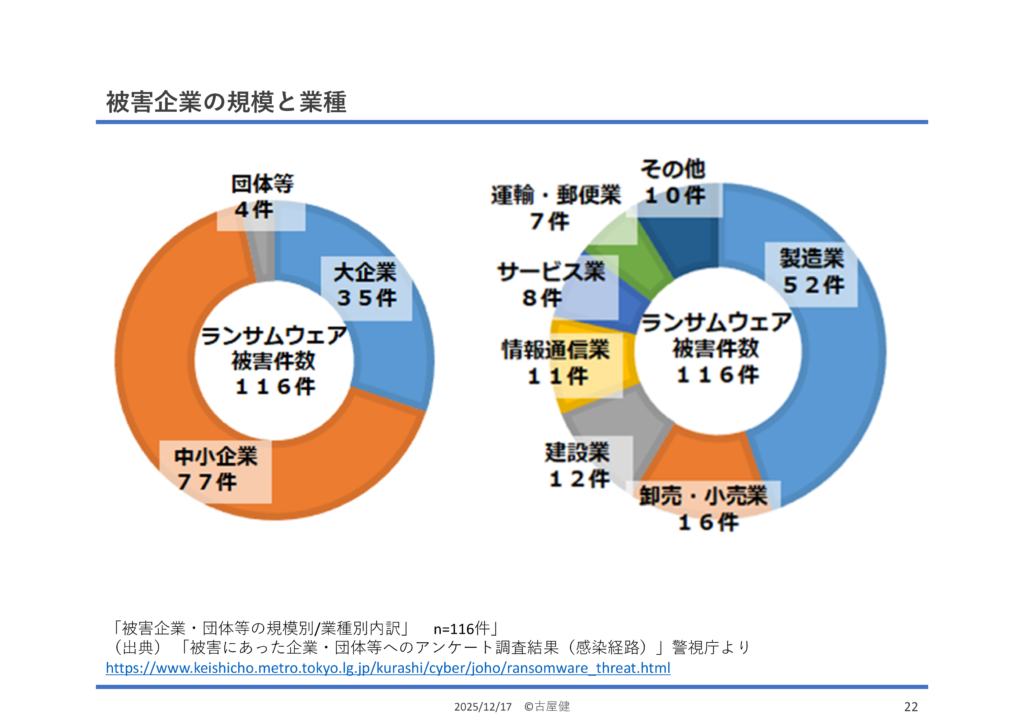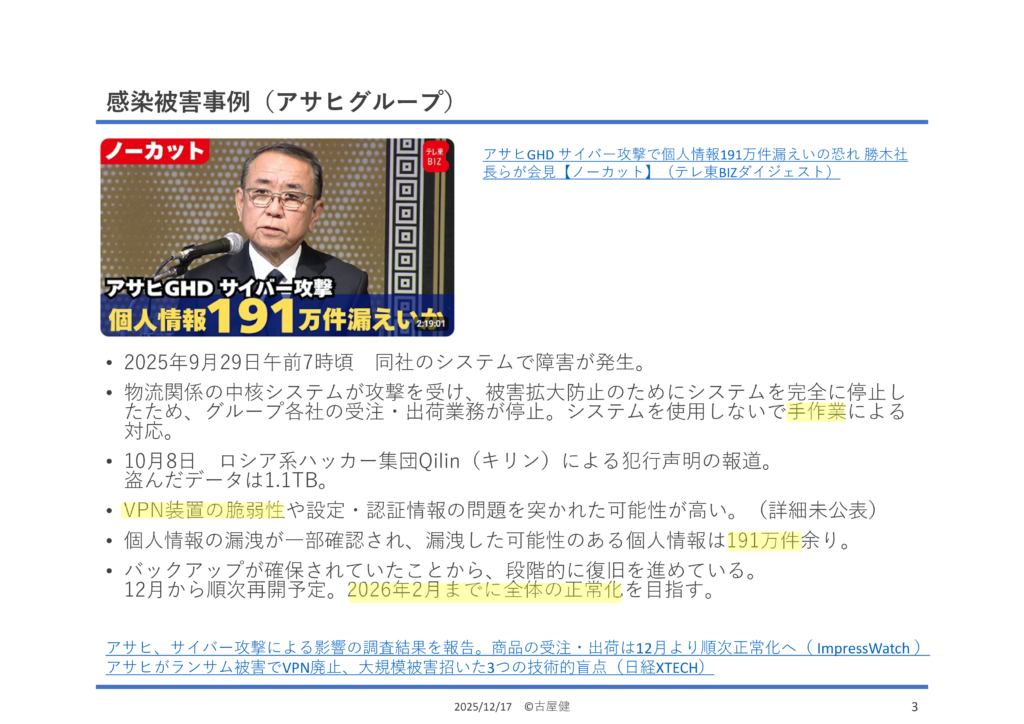 ちょうど被害にあったばかりの、アサヒグループ、アスクルをはじめ、ニコニコ動画が2か月停止したKADOKAWA、トヨタ国内全工場の生産が止まった小島プレス工業、士業関係から社労夢のエムケイシステムと、東京海上の委託先だった税理士法人高野総合会計の6社の事例を紹介しました。下請け企業の被害がサプライチェーン全体に波及したり、取引先・業務委託先に提供していたアカウントから本体への侵入を許す事例が多いことが分かります。