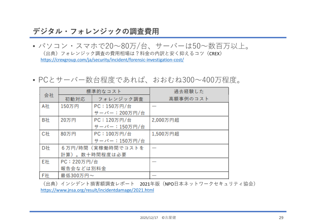 あまり聞きなれない、「デジタル・フォレンジック」費用。どのように侵入されたのか、何が盗まれたのか、それを調べるための費用です。今後の対策や盗まれた個人情報の範囲などを特定するために避けて通れないコストなのですが、これがえぐい。合わせて、サイバー保険のお話もしました。