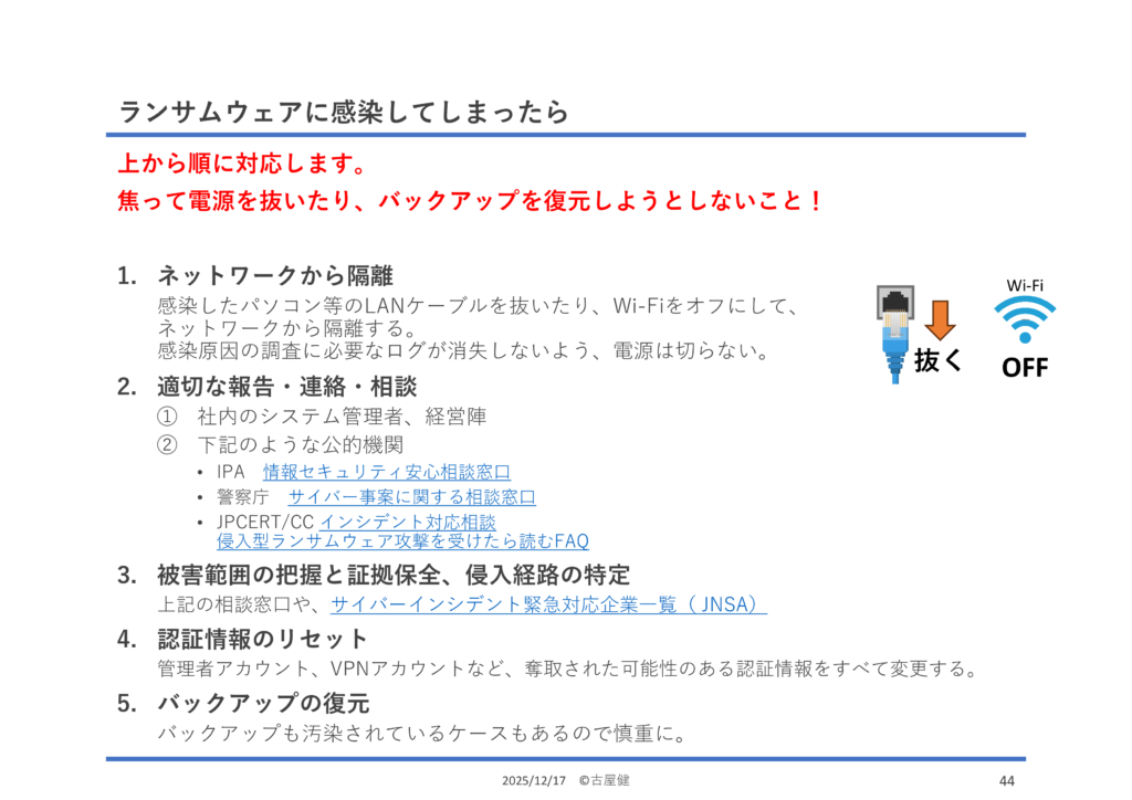 まずは、ネットワークの隔離と報告。場合によっては、個人情報保護委員会への報告も必要となります。