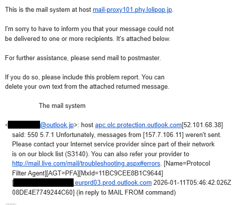 Outlook.jpを使っている方にメールを送ると、送ってすぐに、送信者Mail Delivery Systemから下記のようなエラーメールが戻ってくる。